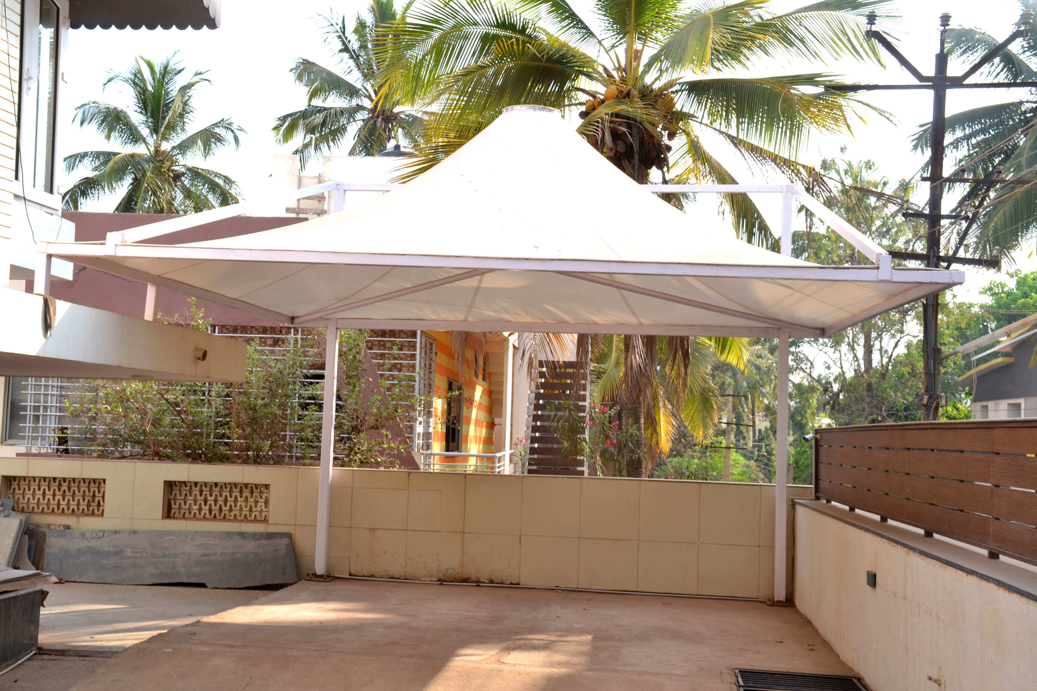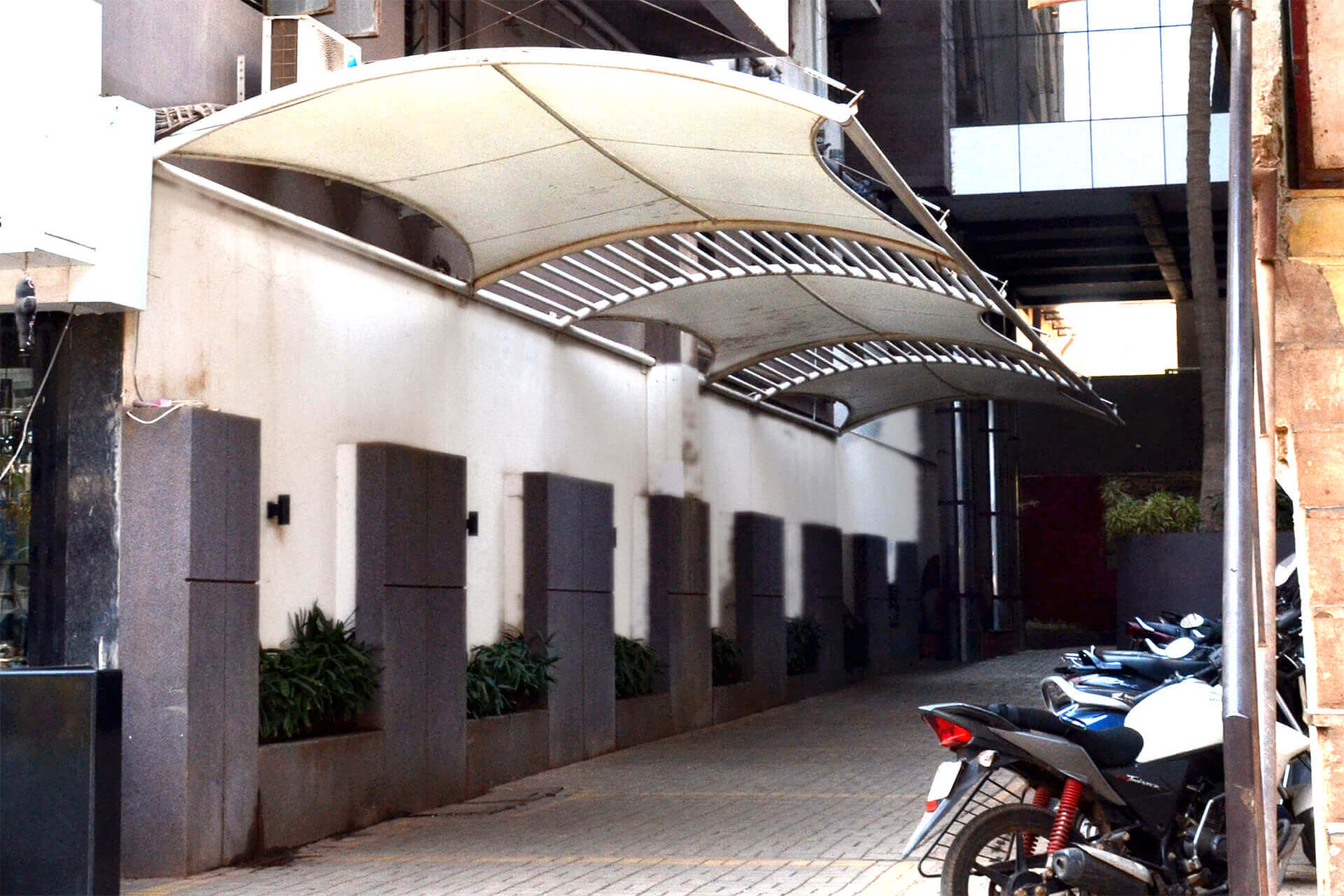 We are responsible for the design and implementation of PVC membrane and Tensile membrane structures as we are the specialists in it across India. Our range of tensile membrane structure are suitable for Car Shades. We offers long-lasting vibrancy and unbeatable durability. Textile structures utilize technical fabric roof membranes, to create proportionally lightweight structures capable of spanning great distances. We offer from SIOEN’s manufacturing plants in Belgium & France high quality – light and heavy weight Coated Textiles for Tensile membrane structures, rooftops, sides, tents, halls, domes, etc.